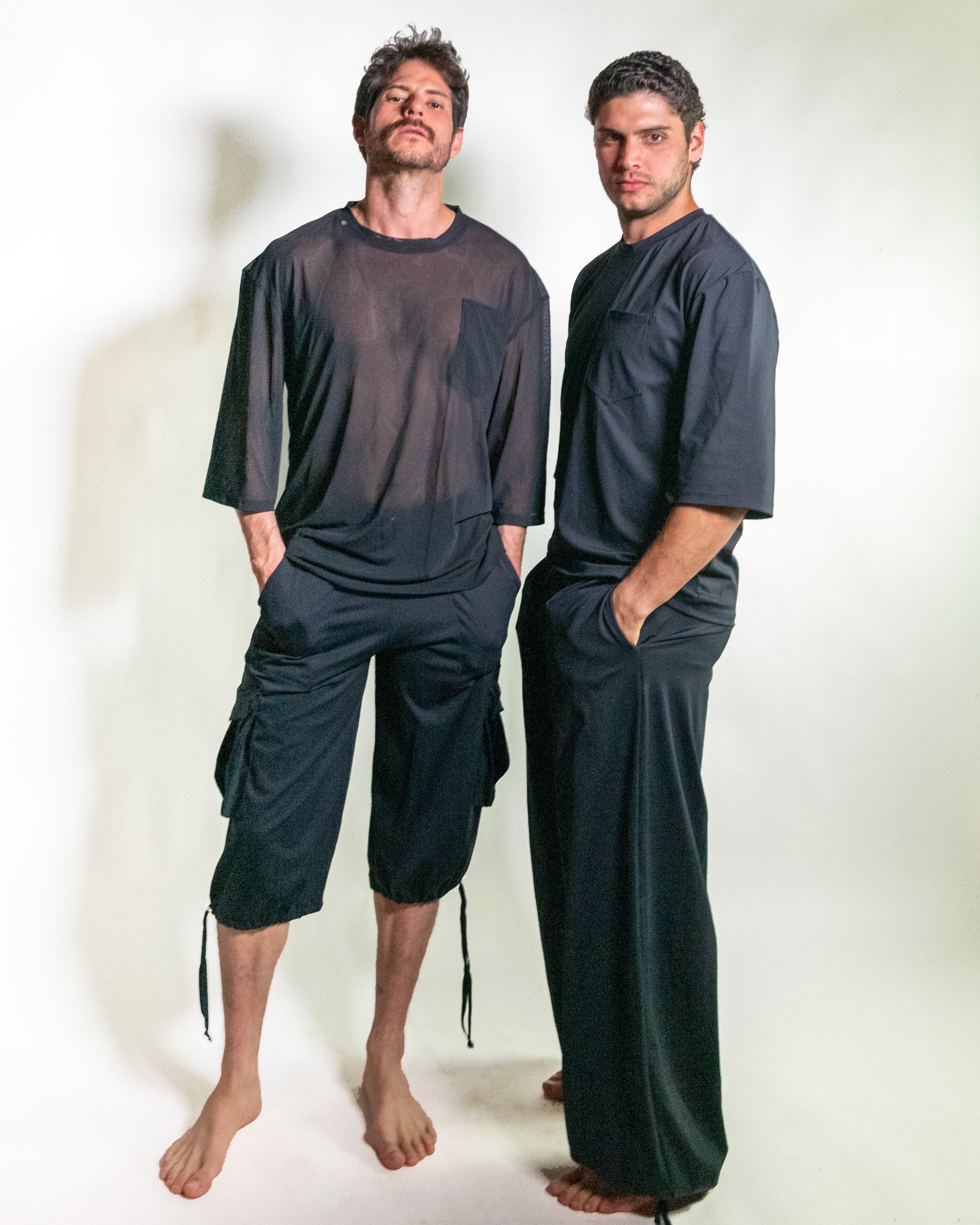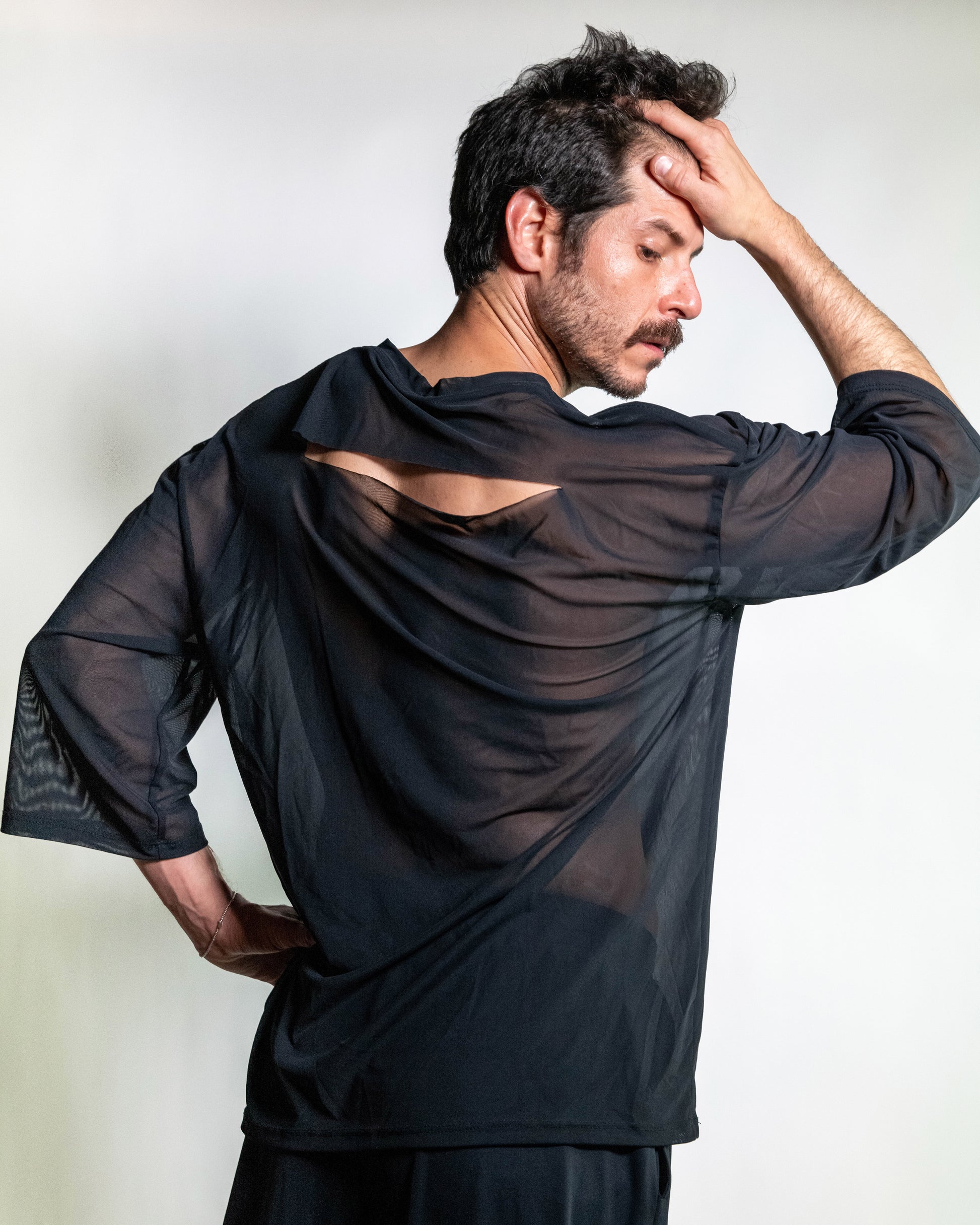 Una T-shirt de mesh con mucho estilo, tiene una bolsa al frente, mangas 3/4 y un detalle inesperado en la espalda.